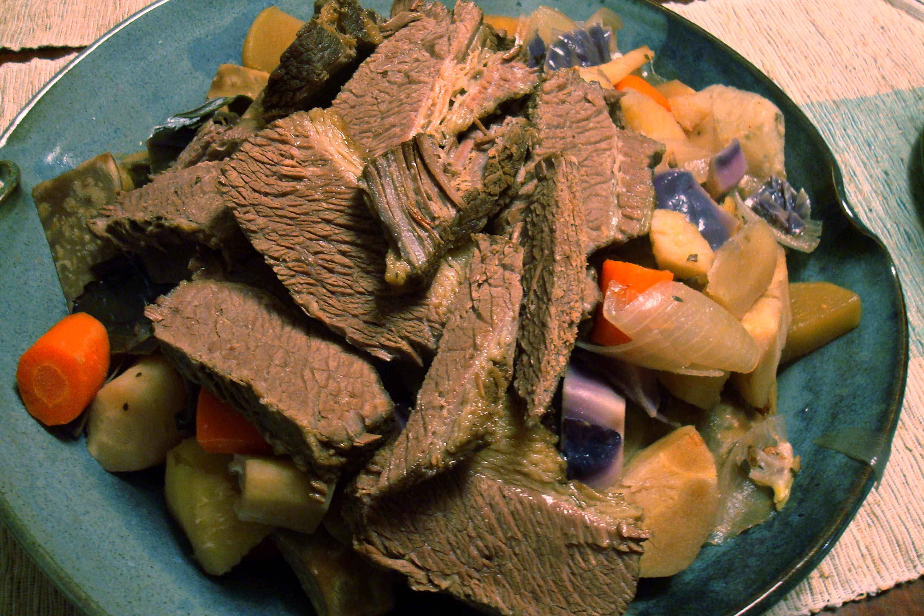 To prepare for the show, I brined my own brisket to make my first corned beef ever. I got a small 2lb. brisket from Deck Family Farms through Corvallis Local Foods. For the brine, I used the recipe Matthew Amster-Burton recommended. But I didn’t have the hours to slow-braise he called for. So I boiled it in stout and then added tons of root vegetables (potatoes, parsnips, carrots, celeriac and rutabaga) and cabbage and onions, as The Oregonian recommended. The tender sliced brisket was delicious with Weinsteiger horseradish mustard and the freshly ground prepared horseradish my friend Rebecka made. I hope corning my own brisket becomes an annual tradition. I love how effortless curing and fermenting is. Maximum taste from just slathering on a salt/spice rub and letting it sit.
