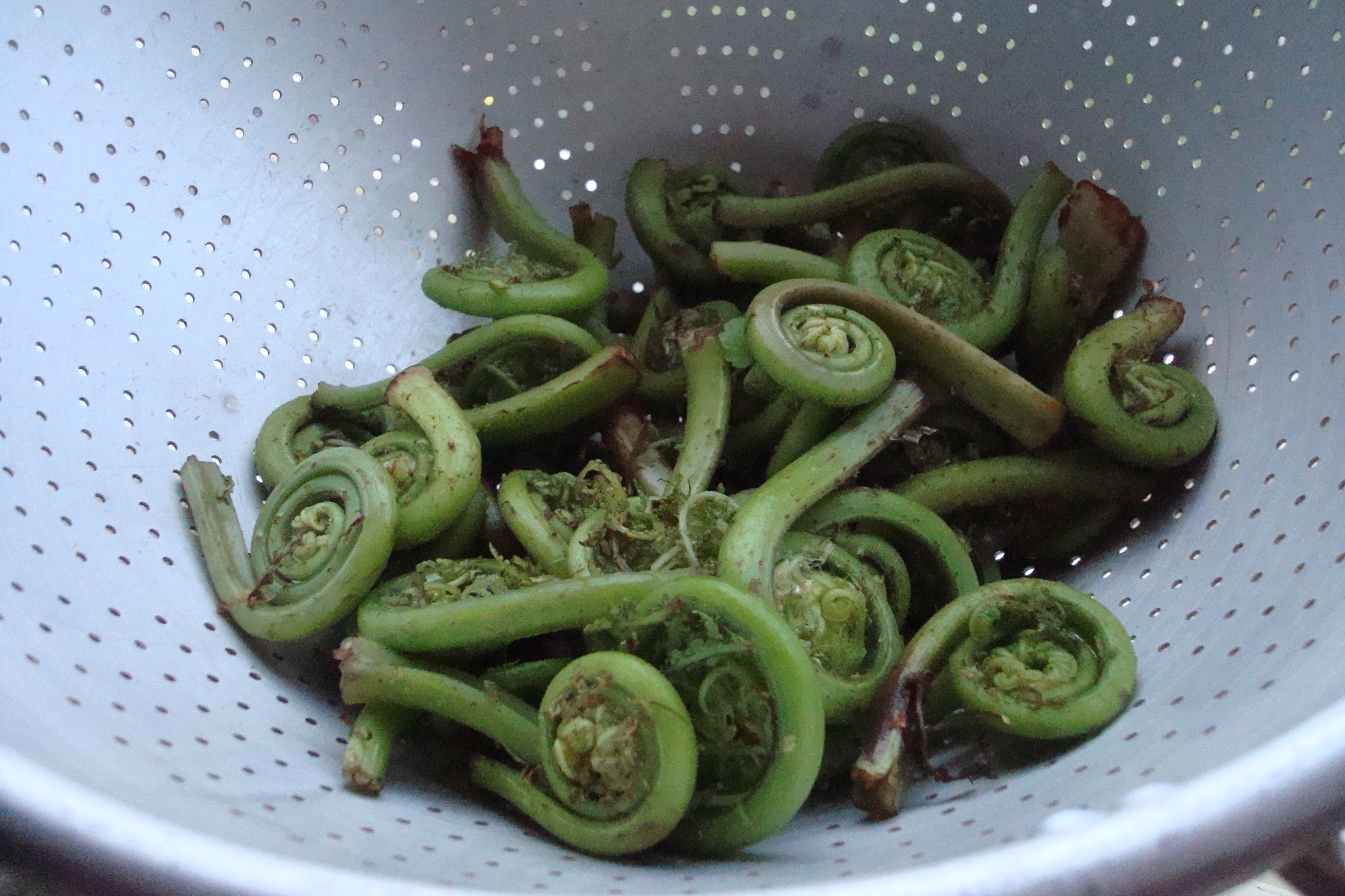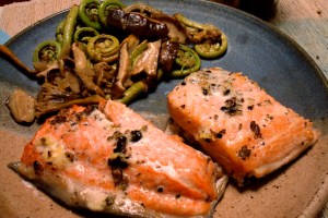 No energy to write now, as I’m still recovering from an early a.m. flight back from my first (and likely last) trip to Vegas. Somehow a meal of foraged and native Oregon ingredients seemed the perfect antidote to Sin City’s tawdriness. So I mustered all the strength I had to get to the Hillsdale Farmers’ Market after the flight landed in Portland. Friend Rebecka from Gathering Together Farm was there and co-host Miriam met me at the market, there in her neighborhood. The fiery coral, first-of-spring salmon called to me, and the freshly foraged fiddlehead ferns and mushrooms. The salmon I rubbed with cracked juniper berries (listening to The Splendid Table inspired me), and then sealed with creme fraiche a la Molly Wizenberg. For the side dish, I sauteed delicate yellow foot winter chanterelle and shitake mushrooms in my home-cured guanicale with onions and garlic, then added the blanched ferns. A simple antidote to a place of excess. Something about being in Vegas makes one want to fast, maybe with one of those lemon juice cleanses. We’ll see if I have the will-power.