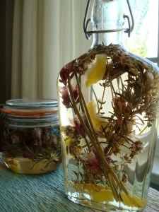 But back to the tarragon. It reminded me of to make my mom’s recipe for tarragon chicken salad, which I brought to an Easter potluck we were invited to today. The recipe couldn’t be simpler: poach chicken breasts, chop up and combine with chopped tarragon, rehydrated golden raisins, sliced toasted almonds and moisten with mayonnaise. Season to taste. To lighten it up, I used Greek yogurt instead of all mayonnaise and added some of my home-infused tarragon vinegar for a kick. I’ve still got a lot of leftover infused herbal vinegar I made last spring. Perfect for salad season!