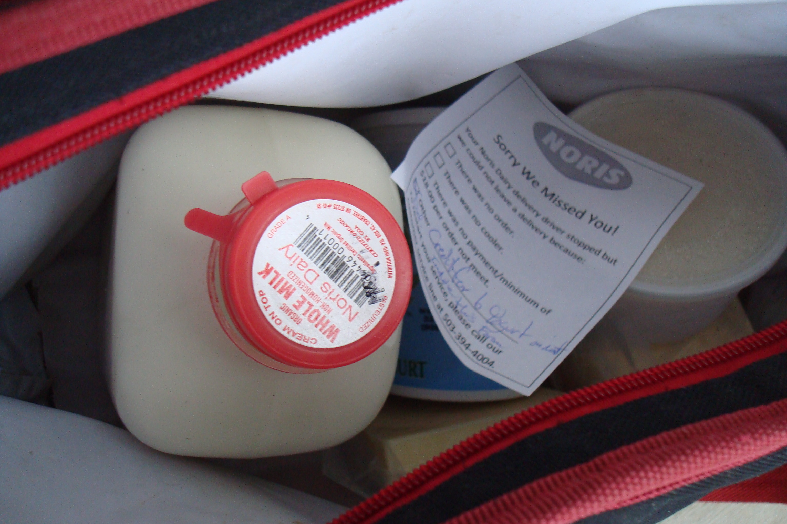 What a pleasure to receive our first milk delivery today. Like canning and knitting and other homey rituals of yore, milk deliveries are making a comeback. I knew the South Mountain Creamery we used to patronize at Baltimore’s Waverly Farmers’ Market delivered, but we never took advantage of that service. And here in Oregon, we’ve usually purchase local Lochmead milk (until learning their plastic containers might contain BPA) and then increasingly Organic Valley. But who knew we had other options?