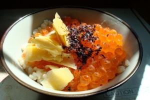 My pickled ginger over too fishy salmon roe. I bought it frozen but it is better (and less smooshed) fresh.