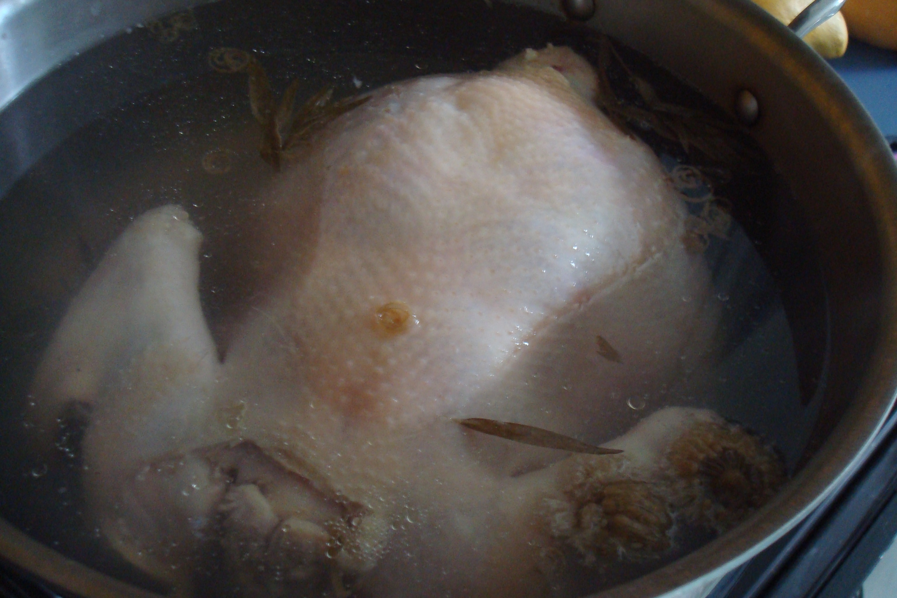 But then Dan came across this hybrid process for “the perfect roast chicken” as a recommended link on the Marginal Revolution blog, beloved by epicurean economists everywhere. So per Felicity Cloake’s advice, I found myself poaching the whole bird for 10 minutes and then firing it at Ruhlman and Keller’s recommended 450 degrees. The poaching method appealed, since I was seeking extra moist breast meat for chicken salad. My mother’s beloved tarragon chicken salad recipe, of course, says to just poach the breasts and cut up that meat. But whole free-range chickens from Draper Valley were on sale, and I’d rather have a carcass to boil down into stock anyway.