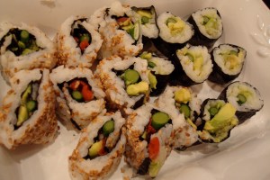 My package of nori prodded me to try an inside-outside fancy maki roll, with rice and roasted sesame on the outside, for the first time. If you line your bamboo mat with plastic wrap it really isn’t any harder than a regular roll. Just really press the rice into the sheet of nori. And cut that sheet in half. I usually use the whole sheet but that makes it actually harder to roll. Cutting is always harder than rolling for me. That’s when the sushi can fall apart. It’s important to cut the rolls with a sharp knife, which sadly mine are not. Nothing like making sushi to remind a gal her knives need sharpening!