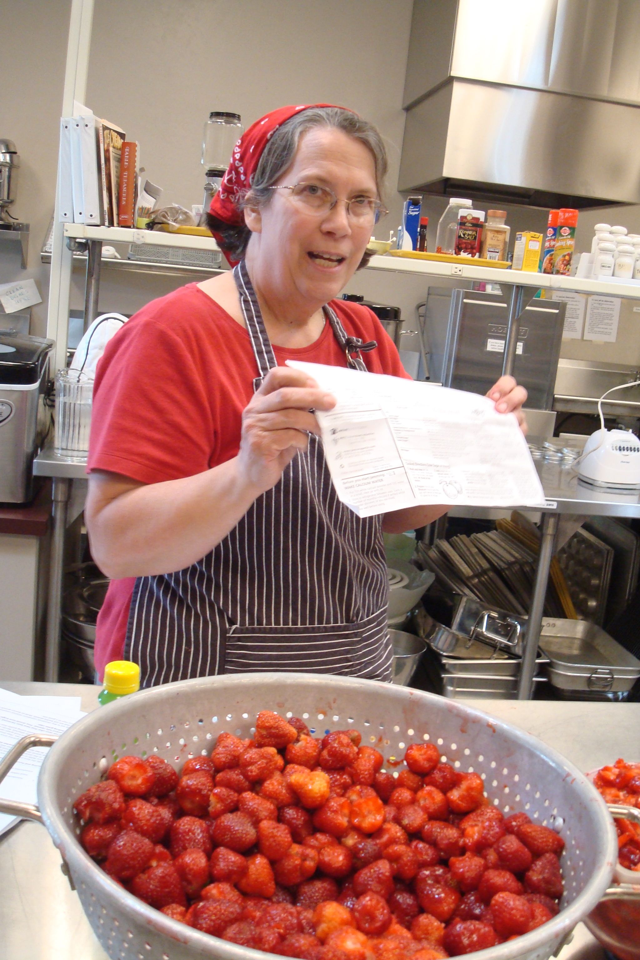 We made low-sugar strawberry jam (and took jars home), strawberry smoothies with yogurt and silken tofu (a food bank staple that often befuddles folks) and a fresh strawberry vinegar for a vinaigrette I helped demonstrate. See the recipe below. I also mixed the vinegar with seltzer for a bracingly tart drink that might be good with simple syrup. Like those Asian drinking vinegars popular at Pok-Pok or old-fashioned shrub drinks. But buyer beware (of stomach ulcers apparently) with the “vinegar cure.”
