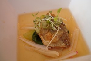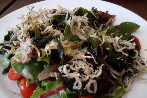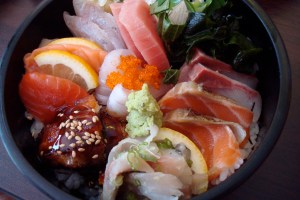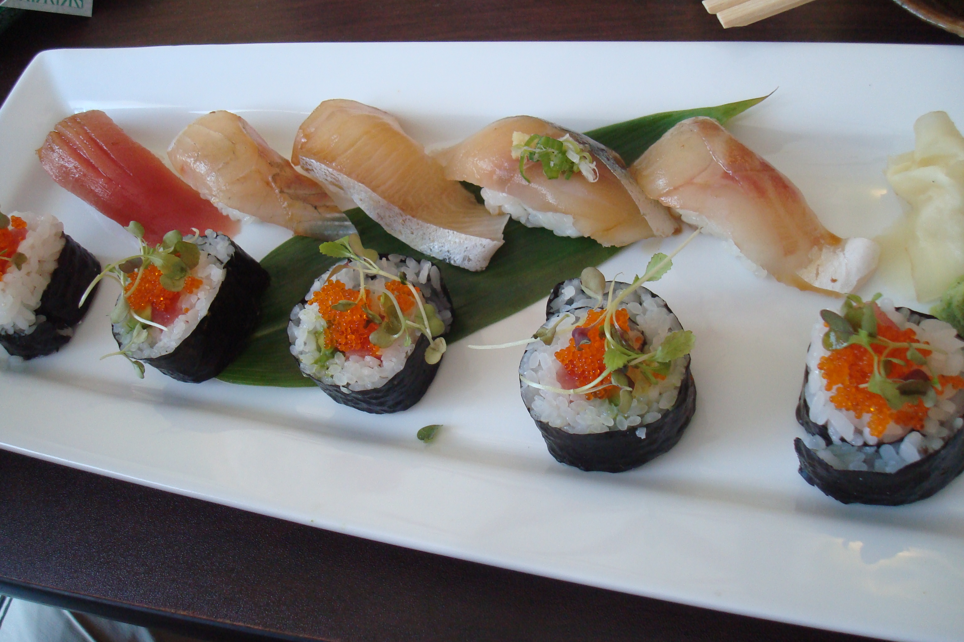 For lunch, the $15 sampler is the way to go. It began with a mesclun miso salad with grape tomatoes. Next, instead of the standard chalky miso soup, we sipped on bowls of sesame oil-and-scallion-dotted, umami-rich dashi broth. Then came a hamachi (yellowtail) scallion roll, topped with grated daikon (perhaps, I couldn’t identify it) and garnished with beet-red micro-greens (amaranth, maybe?). But first, I now remember, our waiter (who blogs at portlandfoodcoma.blogspot.com) brought us an amuse-bouche of delicately fried butterfish.