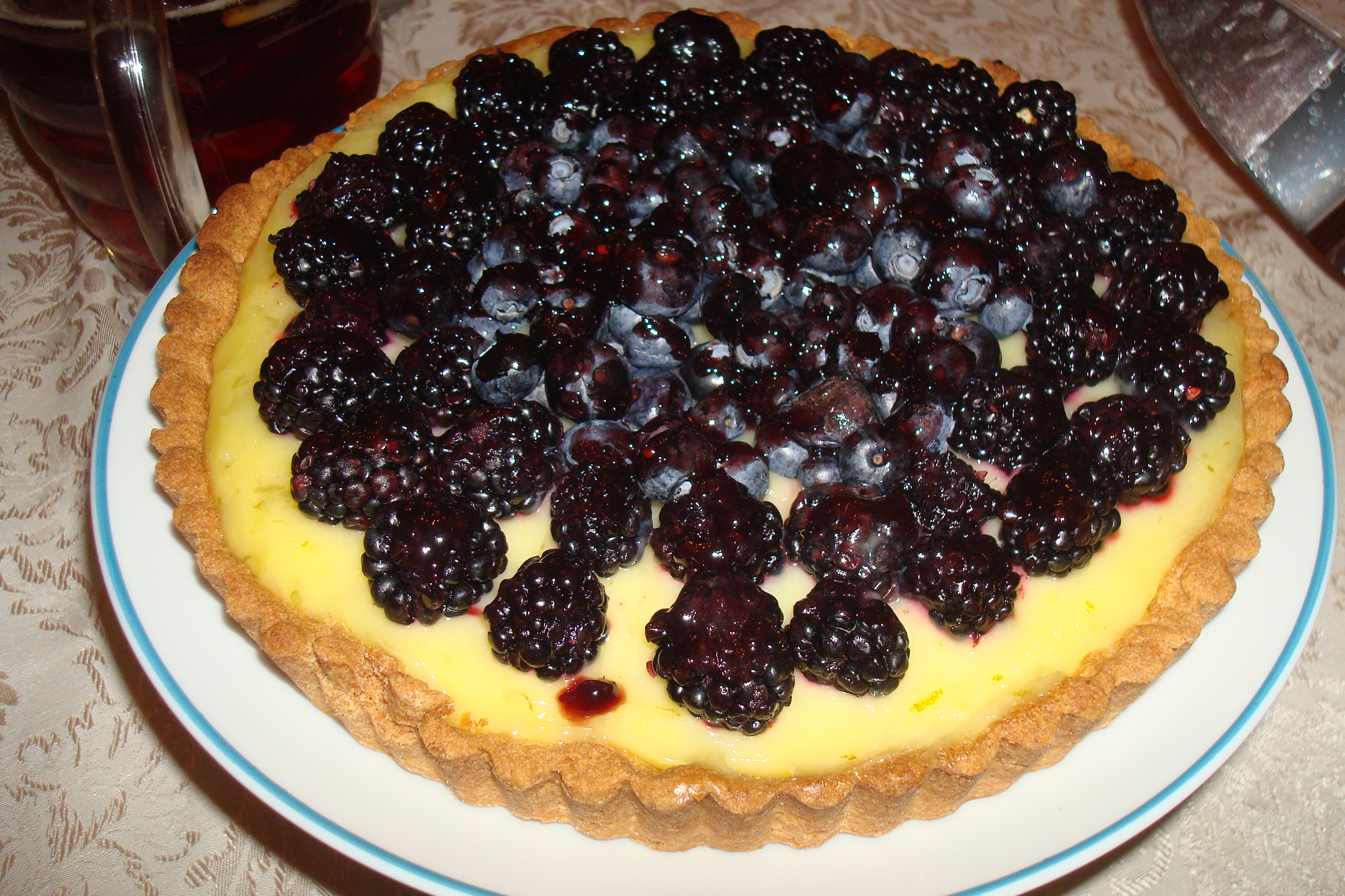 Then just two days later, curd turned up again in a berry dessert tonight at dear reader Judy’s house. She made a magnificent lime curd tart with blackberries and blueberries that looked just like the picture that ran with the recipe in Bon Appetit! With no whipped cream, this fruit tart was a considerably lighter dessert, the perfect conclusion to a barbecue on a warm summer night. Best of all, the latter curd takes less time to make, requiring a mere six minutes of whisking instead of 30. This one calls for gauging the curd temperature with an instant-read thermometer, but both curiously instruct you to press plastic wrap onto the surface of the curd while it cools? Does that just ensure it has a smoother texture? That’s one recommendation I ignored. Here’s a good step-by-step guide to making curd from Bon Appetit. I’ll have to ask Portland cookbook author Ivy Manning why the process she outlined in The Farm to Table Cookbook took so much longer.