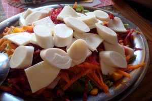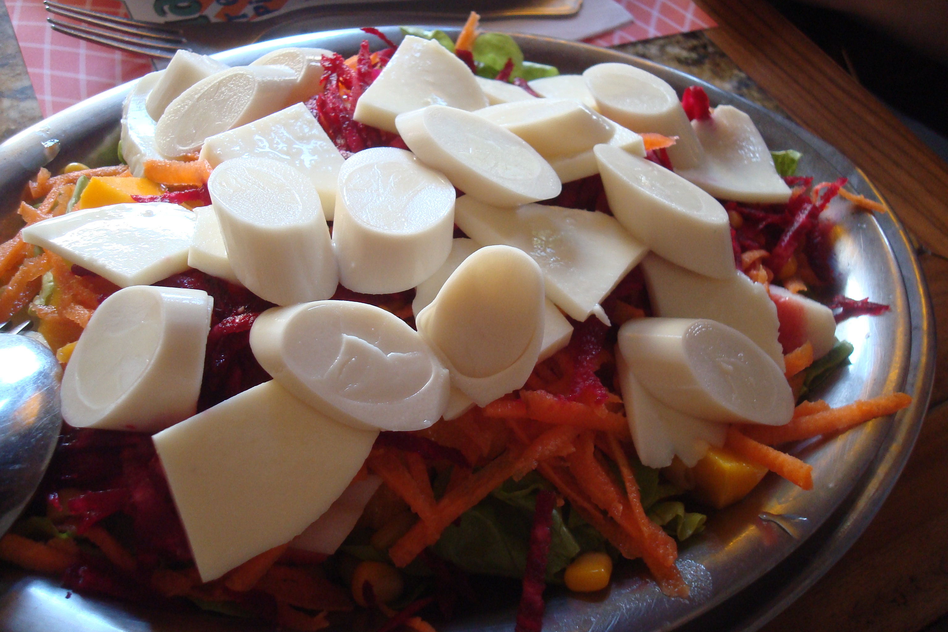 But unfortunately food poisoned me that final afternoon in Rio. To make matters worse, the offending meal wasn’t even memorable. I should have realized the imitation crab sticks in my salad (which I don’t even much care for) tasted less than fresh. After a trip of magical meals, the restaurant in question was forgettable, a nondescript Portuguese-Italian cafe with a yellow awning on Avenida Ataulfo de Paiva whose name I can’t remember, just down the road from the excellent Jobi (if only we’d lunched there one more time instead!). The draw of this nameless cafe on our last day was the outdoor seating. And after a week of heavy eating, I craved salad, even though some members of our party avoided raw veggies, given they chance they were washed in less than perfect water. Two salads with “kani” and that ubiquitous heart of palm caught my attention. “What’s ‘kani’?,” we asked the waiter, in butchered Portuguese. He returned with a pathetic-looking crab stick on a plate. So why did I spring for the “Salada de Kani com Manga”? The other ingredients appealed to me. Heart of palm, mango, buffalo mozzarella from the water buffalo they actually have in Brazil (not as good as the Italian variety, though), lettuce, corn, peas. The salad was unfortunately bland, with a plan olive oil and white vinegar dressing. I ate most of it anyway. Dan ate a tad of it, but avoided the now-suspect kani. Why didn’t I trust my instincts?