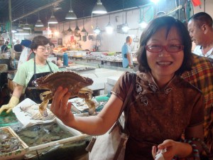 Chen’s Ningbo Crab with Sticky Rice Cakes (nian gao) was about the best thing she prepared for us at her apartment in Hangzhou. We met her at a local, open-air wet market, where she picked out the still-swimming fresh crabs. At the market, she also bought those pillowy glutinous rice sticks (nian gao) so much fresher than the refrigerated or frozen “rice ovalettes” (known as dduk in Korean) you find at Asian markets here.