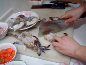I had no problem watching Hangzhou TV chef Chen Leilei do it when she gave me a cooking lesson back in China in August. But I had more trouble when I tried to recreate the recipe, using too-small Maryland Blue crabs, with my dad in Virginia.