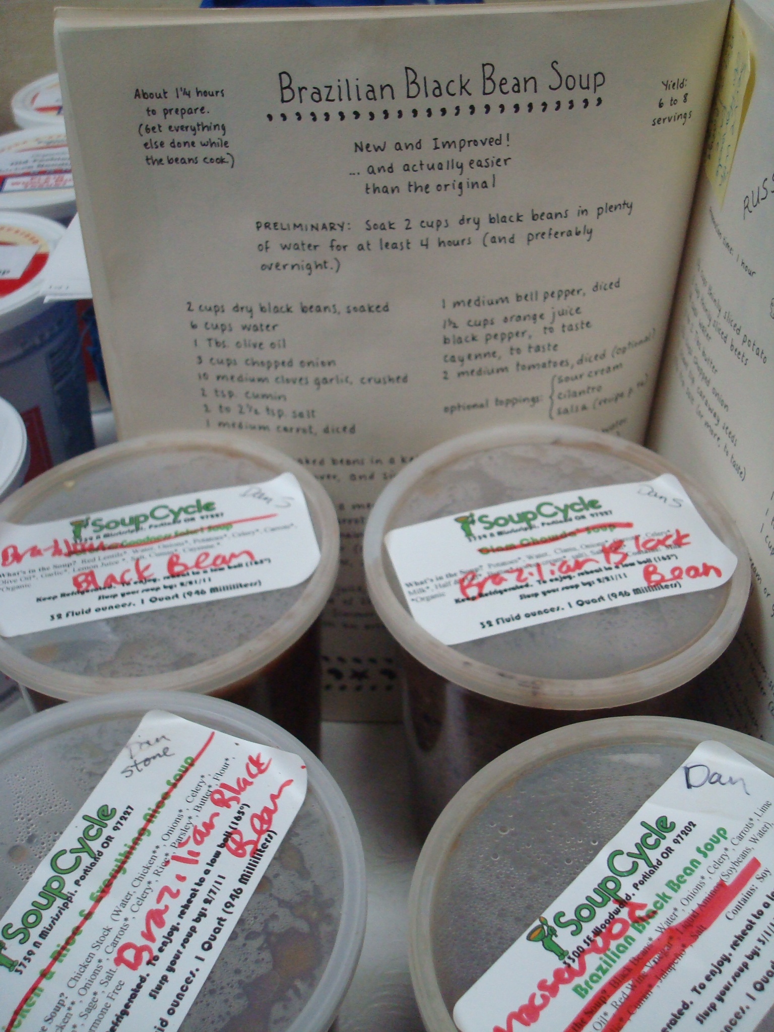 For both swaps, I made Molly Katzen’s standby Brazilian black bean soup from her Moosewood Cookbook (see recipe below), recommended to me years ago by Dan’s aunt Amy. Most Brazilian black bean concoctions–think feijoada–involve smoky pork, but the Moosewood recipe is, of course, vegetarian. It’s bright and citrus-y, punched up with orange juice, diced tomatoes, cayenne and cumin. I even used locally-grown Black Valentine beans from Matt-Cyn Farms.
