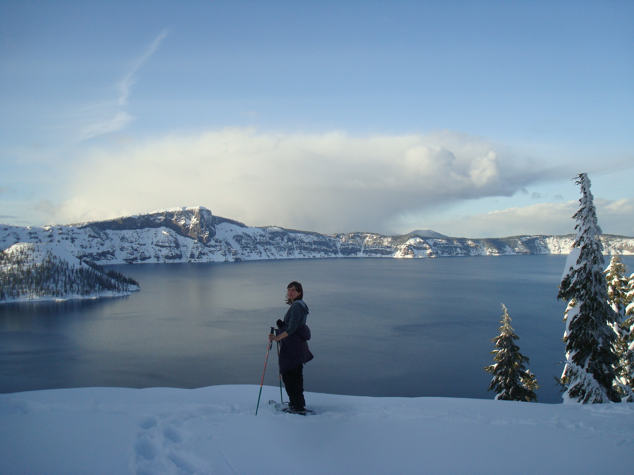 Fortunately, we had clear views of the lake, which clouds and snowstorms obscure half the time this time of year. The 3-mile road to Rim Drive was closed, however, due to avalanche risk (gulp!). We played it safe and took the easy, well-compacted snowshoe route up to the top. And what a pristine view we had all to ourselves when we arrived at about 6 p.m.