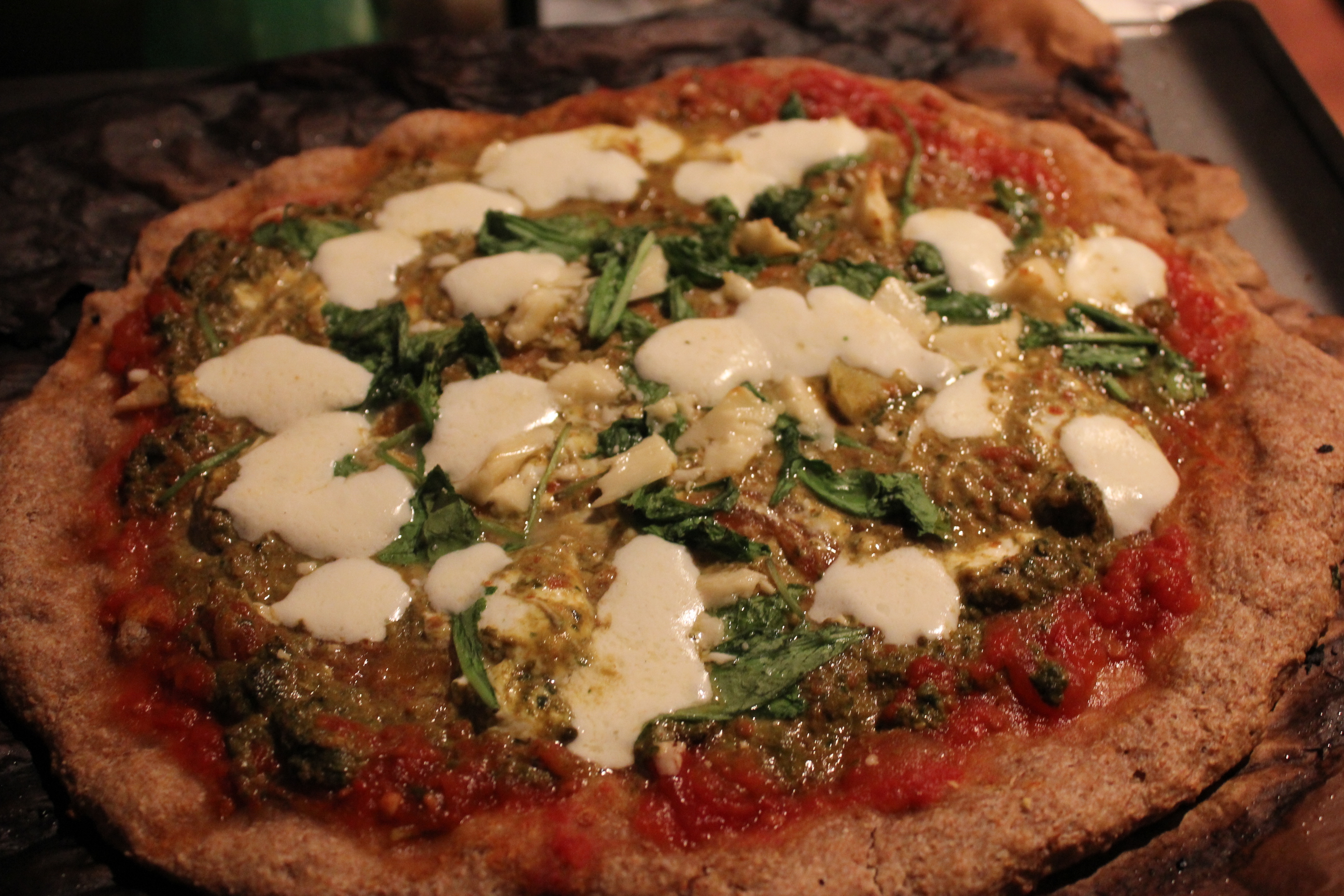 The key to good homemade pizza is a good dough. And I have finally found the go-to dough of my dreams in Piper Davis and Ellen Jackson’s fool-proof recipe from their ever-reliable (Portland and Seattle favorite) The Grand Central Baking Book. I’m much more improvisational cook than methodical baker, but Davis and Jackson have me seriously considering playing for the other team. The key to good pizza, as revealed by this book, is a pre-ferment, otherwise known as a poolish or overnight starter. This quick night-before step yields an incredibly chewy yet crisp crust with bubbling air pockets like a good artisan bread. You simply mix flour, water and yeast together and let it sit for about 12 hours. It’s then riddled with holes, with the stringy consistency of melted cheese when stirred (photo is on my other camera card). Then you mix it with the other ingredients (bless you, KitchenAid dough hook!) into dough. No proofing or activating yeast with sugar or honey. Davis and Jackson are also call for a generous amount of salt. That’s key to a flavorful dough. And make sure your flour isn’t rancid. The pre-ferment softens the glutens in a tough hard whole wheat flour, so you don’t need to add white flour. I can’t locate the cookbook in my moving boxes at present, but its pan pizza recipe (which also stresses the pre-ferment) is at least online.