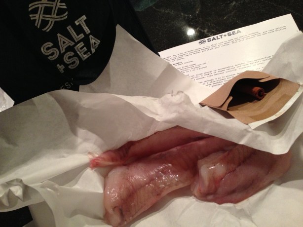 They also included a recipe card for “Roasted Monkfish,” to take the guesswork out of how to cook this new fish. The recipe came from Mark Bittman’s How to Cook Everything. I dredged the monkfish steaks in a mixture of flour and chopped herbs, salt and pepper and preheated the oven to 450 degrees. I seared the fish in a hot skillet, browning on all sides to develop a crust. I added broth to the pan and then transferred it to the hot oven to cook until it was tender. And tender and sweet it was. Now I just have to ask Salt & Sea how to get my hands on monkfish liver, a Japanese delicacy I once enjoyed at a cute Brooklyn sushi spot, whose name now escapes me, with my sister-in-law, Julia.