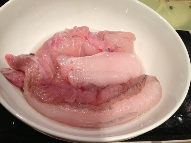 The whole fish thankfully came gutted and cleaned. Justine said folks most often remove the head, fins and tail, then dredge the fish in egg and flour and either fry or bake them. But my in-laws had just arrived, so we opted for take-out (something we rarely do) to avoid the mess of frying fish.