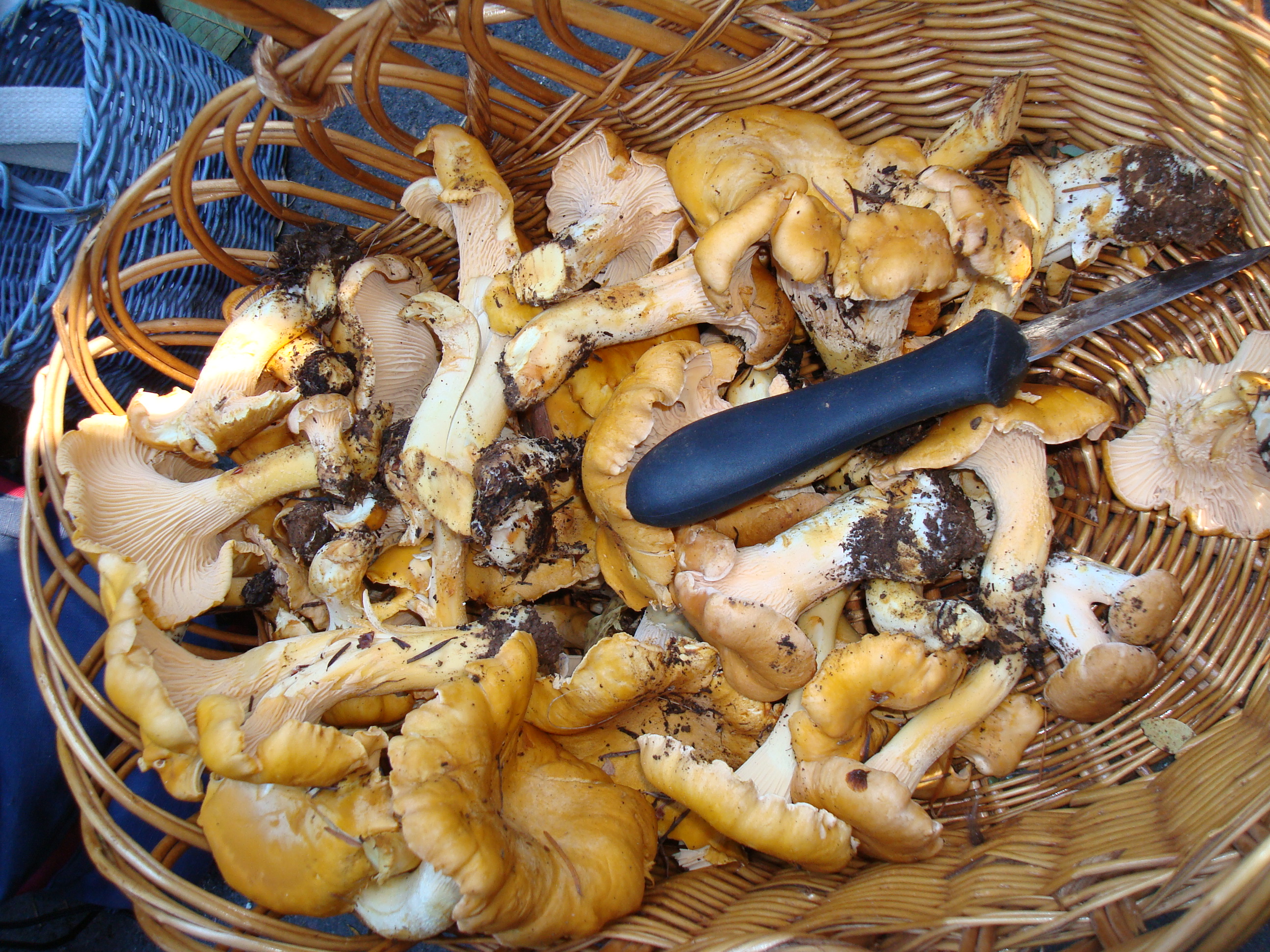 Fluted Pacific golden chanterelles, known as Oregon’s state mushroom, were the object of our search in the shaded woods of Alpine, a rural timber town between Corvallis and Eugene. For those who fear death by poisonous mushroom, the chanterelles are among the easiest to pick out. Their amber color stands out against the damp, loamy forest floor, yet much of the mushrooms’ flesh is concealed under the soil, leaves and underbrush. (Unfortunately that’s not my bountiful harvest below, but I did collect a paper lunch-bag’s worth.)