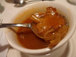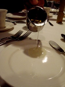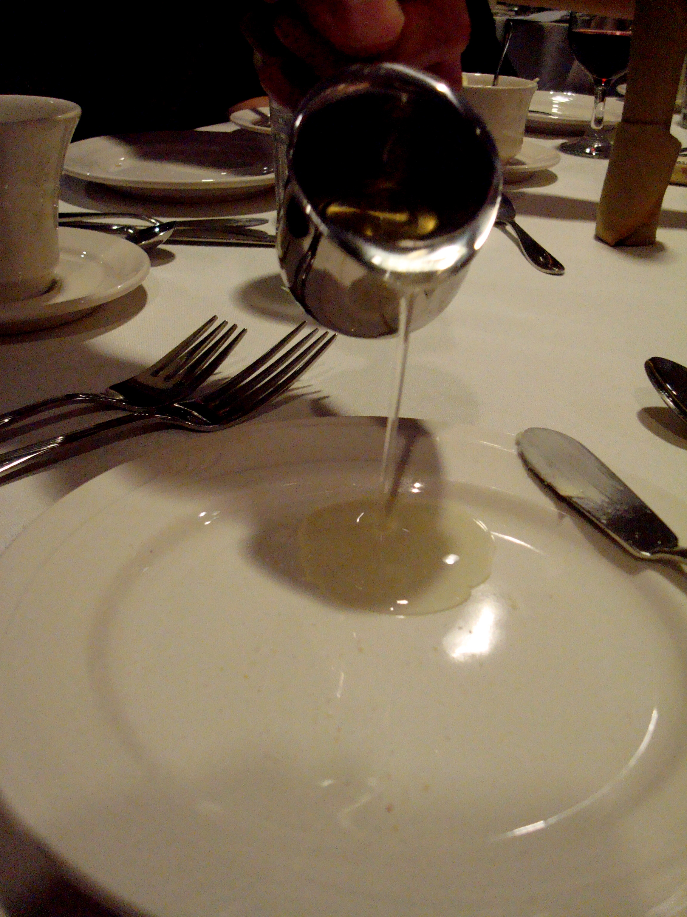 The meal began with rosemary ciabatta bread dipped in Czarnecki’s glorious white truffle oil, purportedly the only all-natural one manufactured with domestic truffles here in the U.S. Delicious as it was, we couldn’t bring ourselves to pay $30 to bring a small bottle of the oil home. I prefer to enjoy my truffles on rare special occasions. I wouldn’t want to get too used to these things, like the son of the Mycological mushroom distributor at our table who wrinkled his nose at truffles, complaining of “truffle breath” and the way they made him burp. That’s a burp that smells good to me. But when they’re past ripe, a rotting one, such as a rare Oregon Brown (Calapooia) truffle specimen I sniffed tonight, can smell putrid.