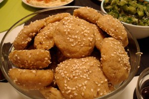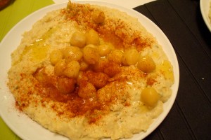 There were unusual treats at this seder table, like potato-matzo meal rolls (anything resembling bread is such a luxury), a smooth, apple-less date paste for the charoset (makes sense since apples aren’t native to region) and plates of creamy whipped hummus. The secret to good Arab/Israeli hummus seems to be the quality of the tahini or tehina (ground sesame paste) which they bring from back home. Ours seems to be thicker and clumpier here. There was no secret ingredient but the hummus was seasoned with paprika, lemon juice, garlic, cumin and olive oil. And garnished with a drizzle of oil and the whole chickpeas. The Israelis were talking of some fabled cook’s top-secret hummus recipe, perhaps that of Abu Hassan’s in Jaffa? Food preferences unite Israelis and Arabs. If only breaking more bread together could somehow lead to peace. But politics was mostly off the table tonight. In fact, the group tonight was surprised that the Corvallis rabbi would hold forth on Israel/Mid-East politics during a Yom Kippur service. But it’s so second nature for us to mix up politics, religion, etc. here.