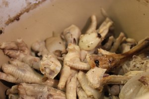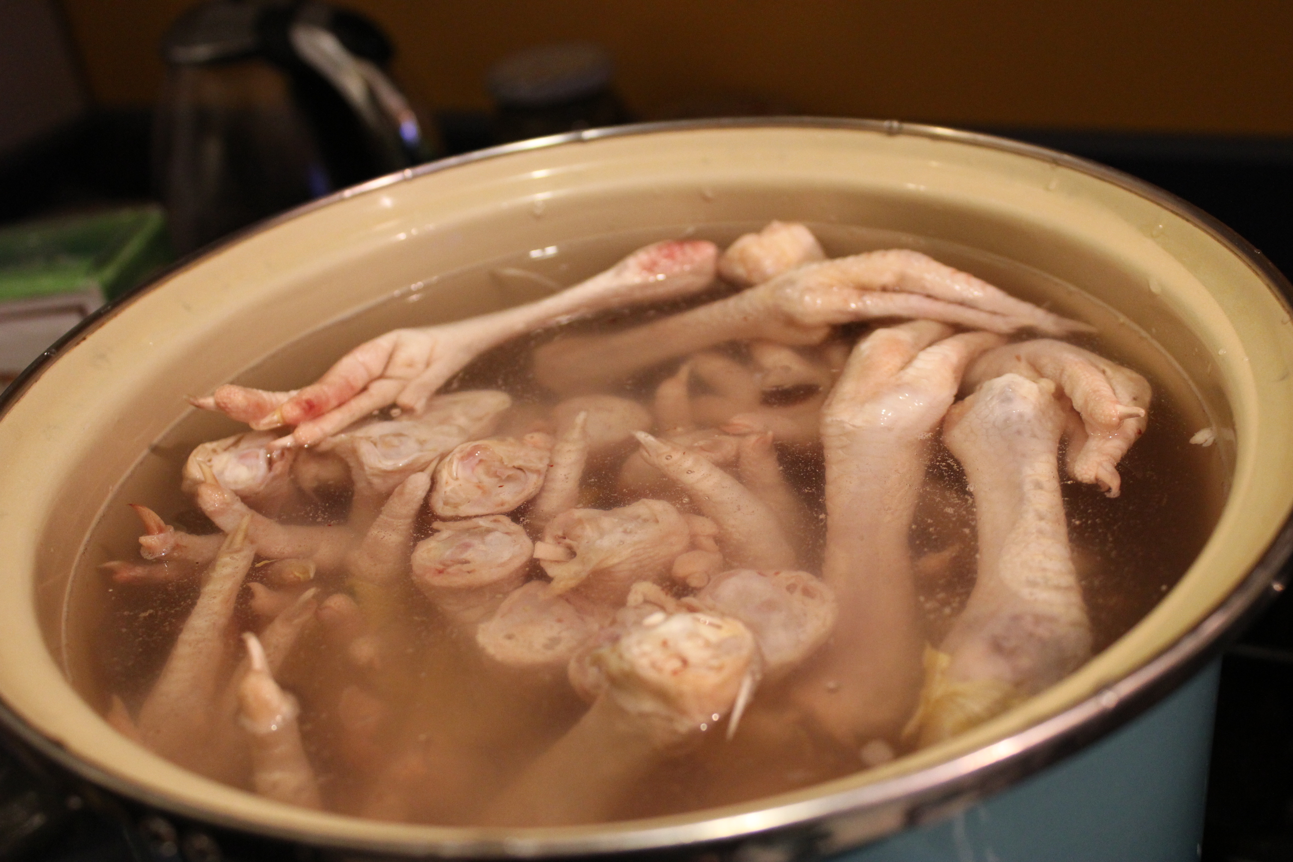 I wanted to make from-scratch chicken stock for matzo ball soup, so what better time to finally try making stock from chicken feet. I turned to a local source of pastured poultry, Afton Field Farm. They only had one bag of the feet left from last year’s processing. Restaurants buy them up for chicken broth. Unfortunately, the feet were freezer-burned because their claws ripped through their plastic bag. That’s why they’re hard to store. I’ll have to go back for fresh ones when chicken slaughtering begins end of May.Prepping the feet is a bit of a potschke. You must par-boil them, chop off the claws at the joint and, with a paring knife, remove any blackish remaining claw pad. The process gets you in touch with your carnivorous–almost cannibal-like–side, given that peeled chicken feet somehow resemble human hands.