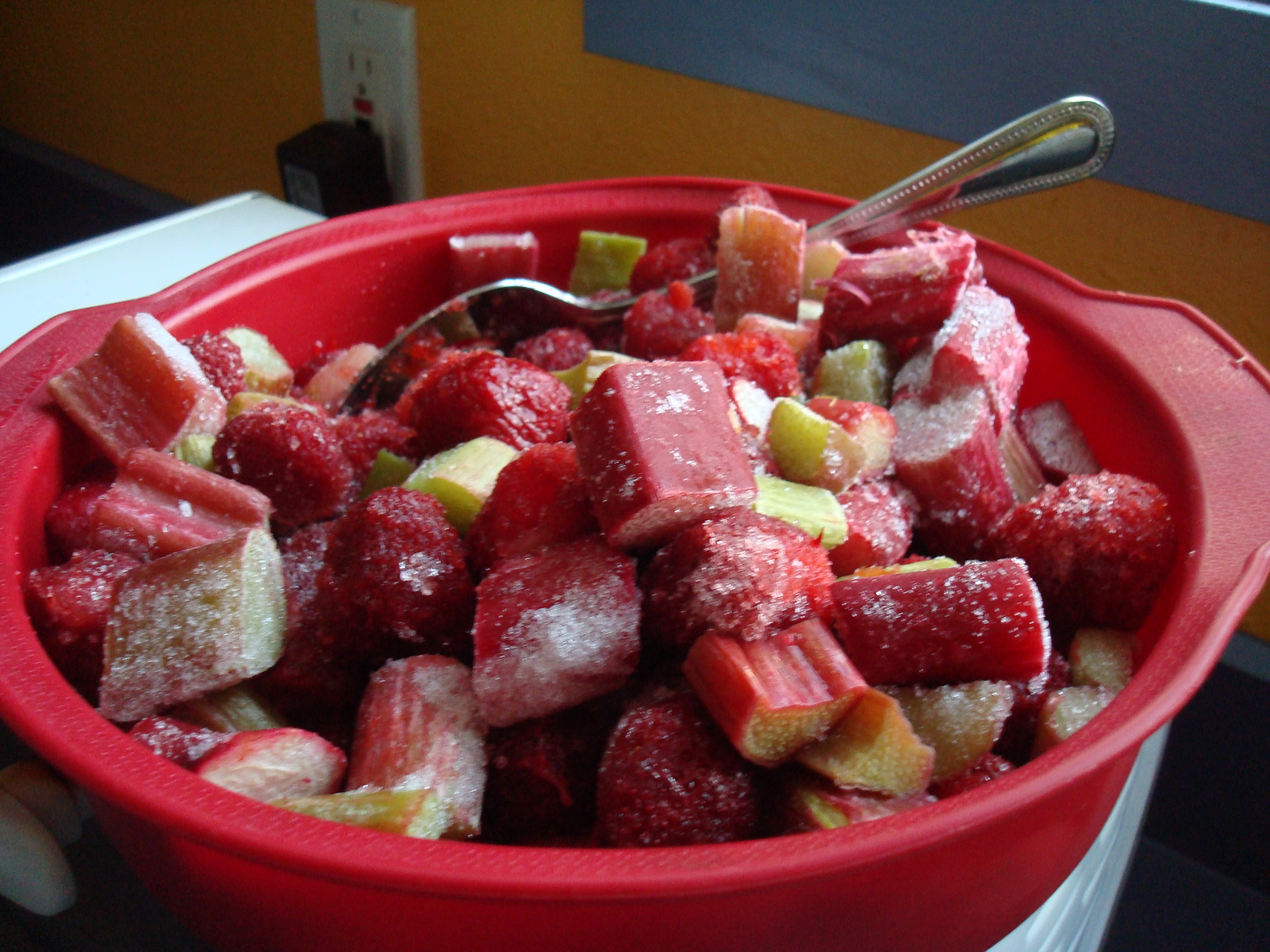 I realized it was finally time to use that gallon-size bag of sliced rhubarb I had frozen when I saw the ruby-red stalks poking up through the mulch in the garden. I couldn’t get enough rhubarb last spring. I think I o.d.-ed on the stuff last April and May, returning home with big bunches of it every time I visited the farmers market. But I never touched that frozen bag of it last fall or winter. I think, as with asparagus and blackberries, and of course, fresh tomatoes, I just prefer to eat my heart out when it’s in season and then abstain until the fresh crop emerges the following spring or summer. That first fresh bite never tastes as good as their frozen counterpart from last season.