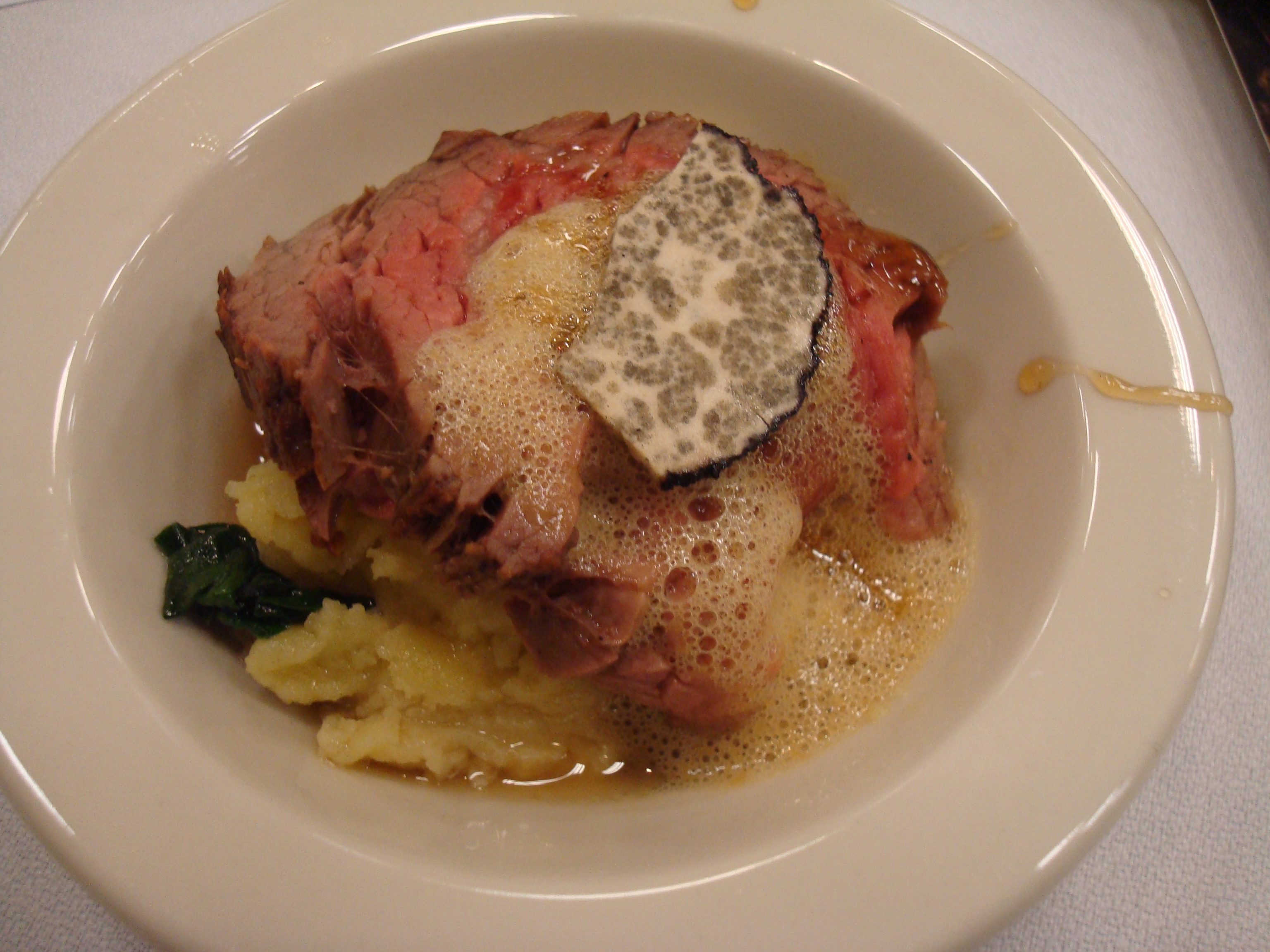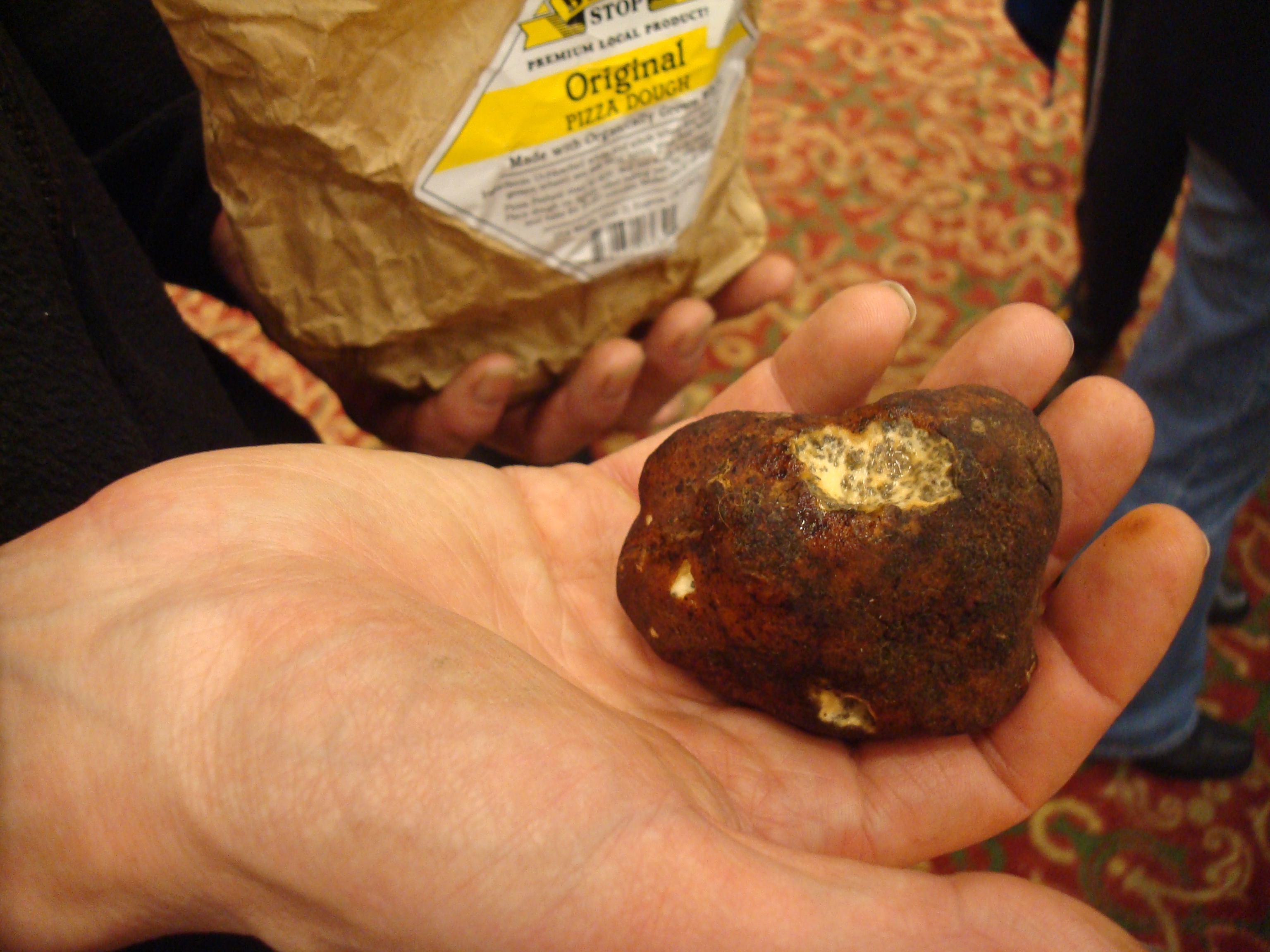 The meal began with rosemary ciabatta bread dipped in Czarnecki’s glorious white truffle oil, purportedly the only all-natural one manufactured with domestic truffles here in the U.S. Delicious as it was, we couldn’t bring ourselves to pay $30 to bring a small bottle of the oil home. I prefer to enjoy my truffles on rare special occasions. I wouldn’t want to get too used to these things, like the son of the Mycological mushroom distributor at our table who wrinkled his nose at truffles, complaining of “truffle breath” and the way they made him burp. That’s a burp that smells good to me. But when they’re past ripe, a rotting one, such as a rare Oregon Brown (Calapooia) truffle specimen I sniffed tonight, can smell putrid.